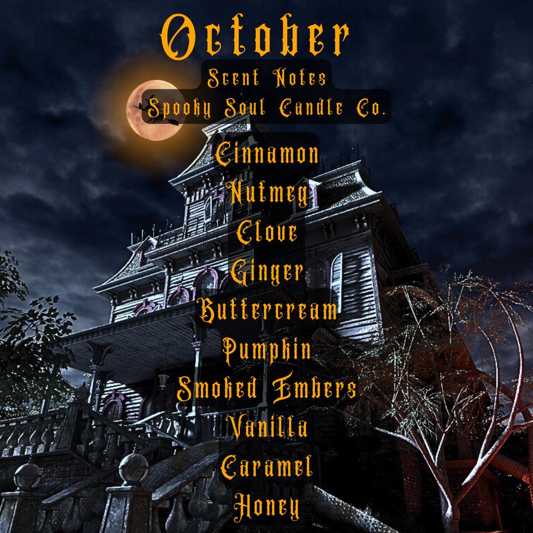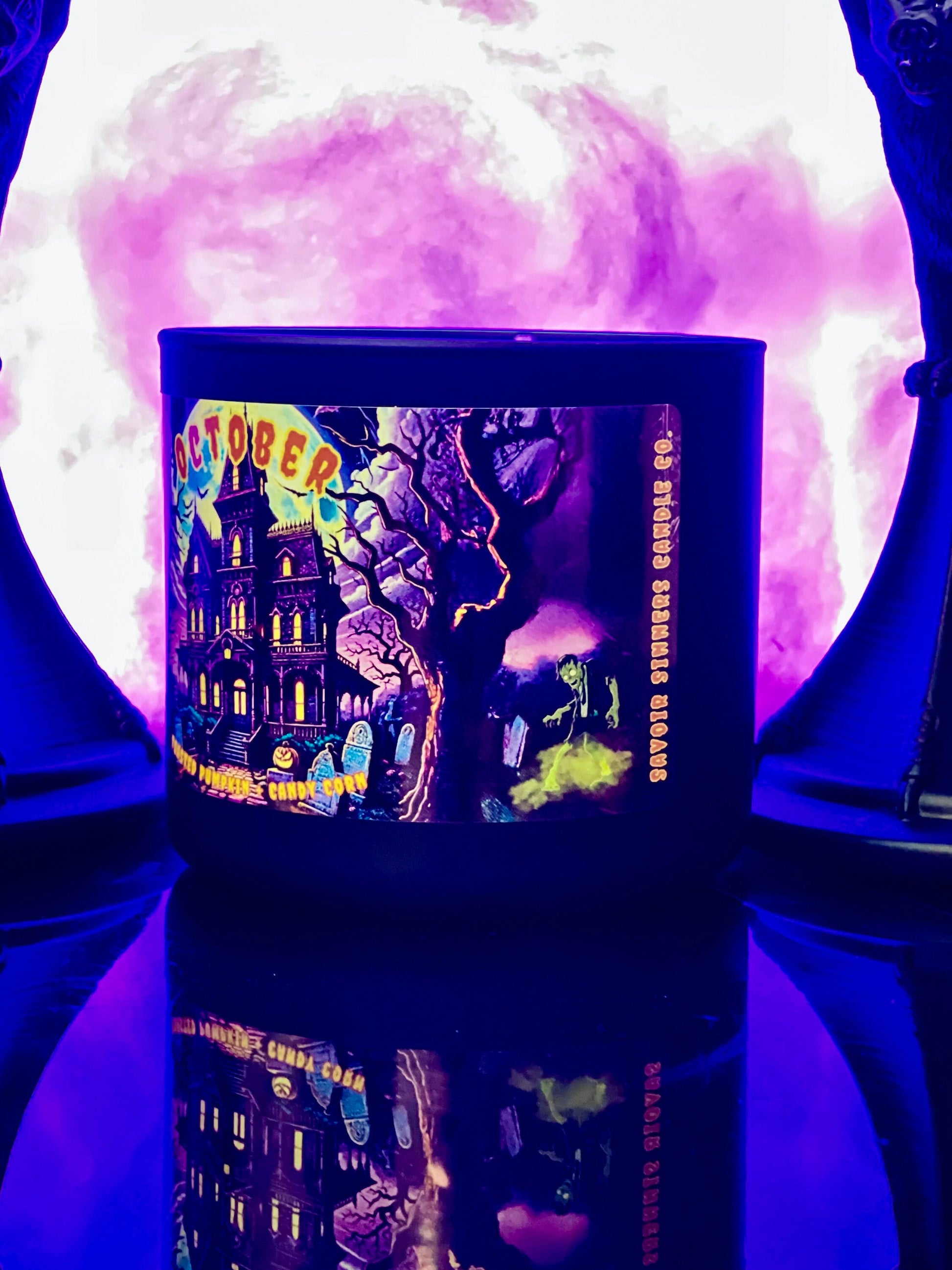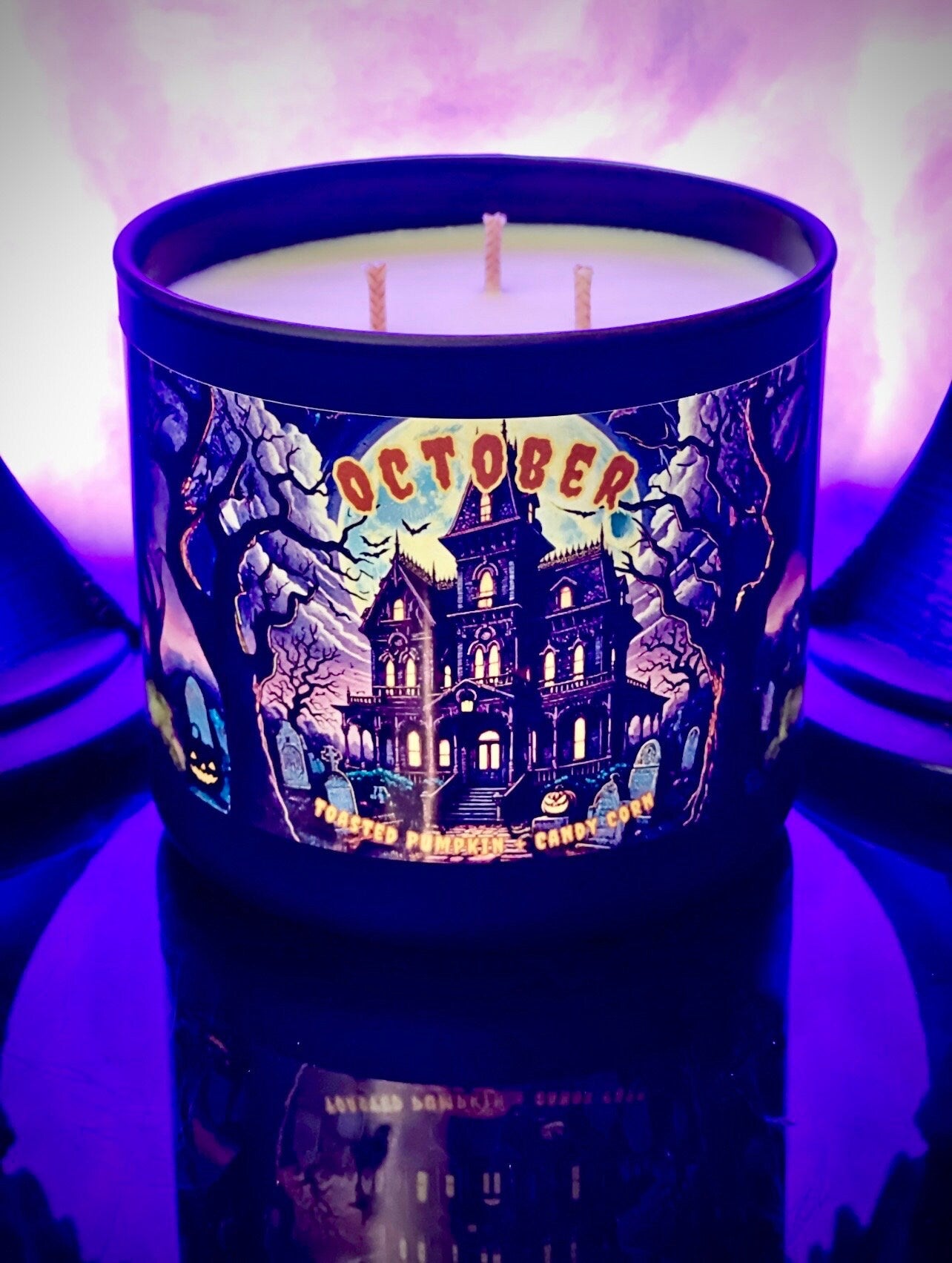 Our October candle pays homage to everything we cherish about this eerie month. From haunted houses and black cats to pumpkins, scary movies, sweet treats, and mysterious sounds that go bump in the night. It offers a spookier twist on the traditional pumpkin scent, with a hint of smokiness that sets a chilling tone. The blend of toasted pumpkin, autumnal spices, and buttery candy corn will leave you yearning for October all year long.